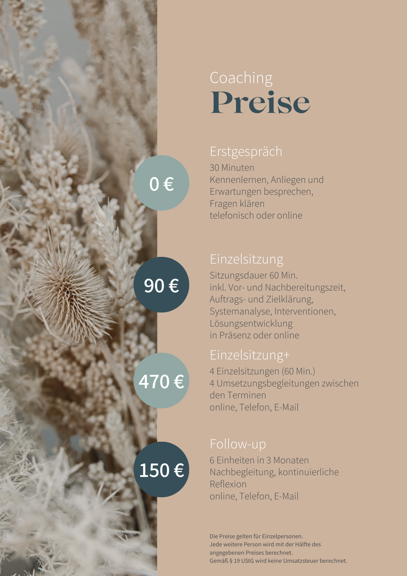 Eine Coaching-Sitzung umfasst in der Regel 60 Minuten zzgl. 30 Minuten Vor- und Nachbereitungszeit und wird mit 90 € berechnet. Du kannst bequem per Rechnung, in bar oder mit Karte bezahlen.