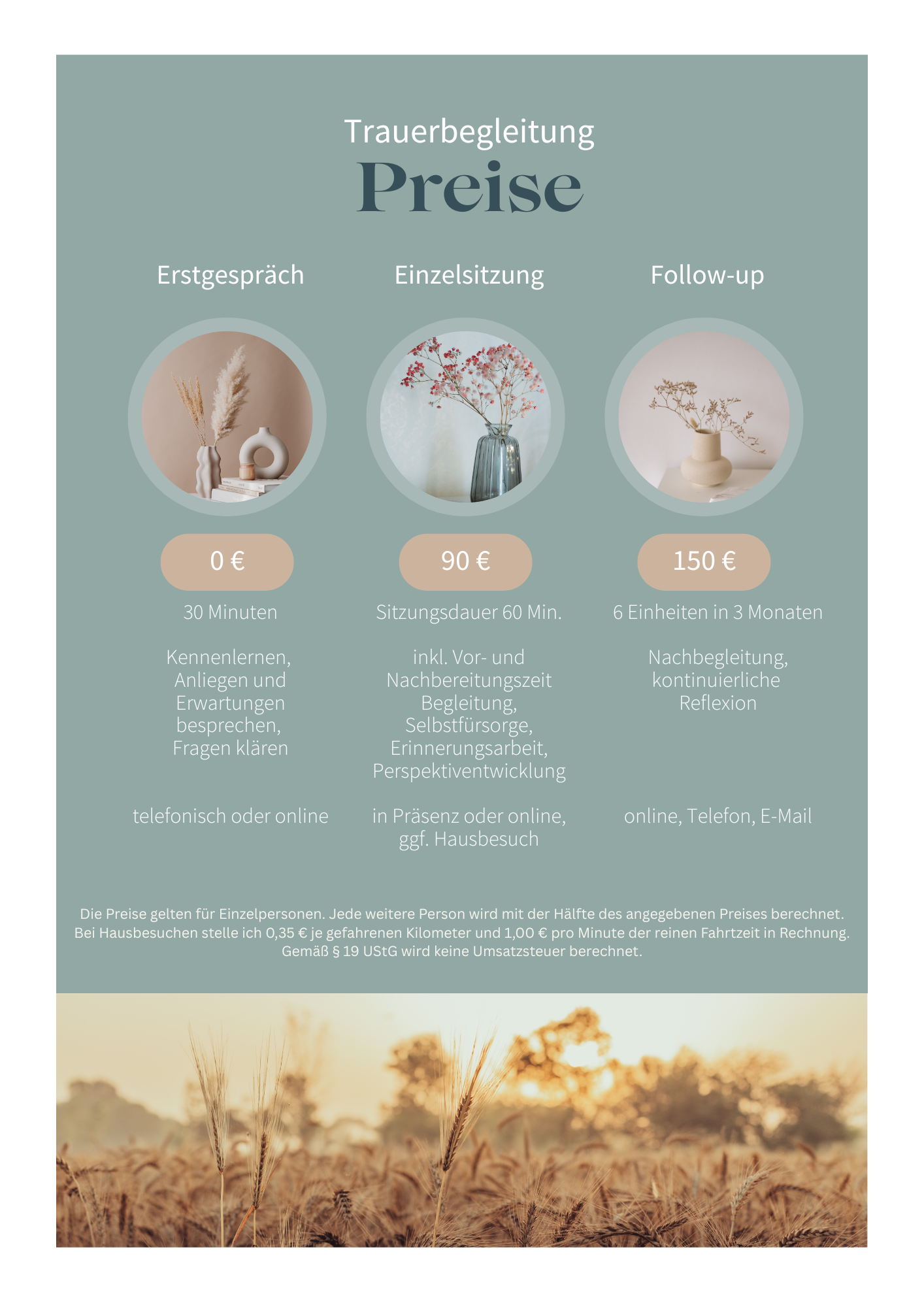 Meiner Auffassung nach widerspricht es sich, das Diskretionsgebot einhalten zu wollen, meine Klientinnen und Klienten im Nachgang einer Trauerbegleitung jedoch aktiv um eine Rezension zu bitten. Die Begleitung ist prinzipiell persönlich und beruht stets auf Vertraulichkeit und Verschwiegenheit. Meine Klientinnen und Klienten teilen ihr Innerstes, da halte ich es nicht für angebracht, um einen Erfahrungsbericht zu bitten, der unter ihrem Namen veröffentlicht wird.